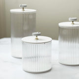Showcase your treats while keeping them fresh and tempting. Made from high-quality corrugated lucite, these cookie jars blend texture and transparency for a striking look. A sleek white lucite lid with a leatherette handle and magnetic closure adds elegance. Available in three sizes.
