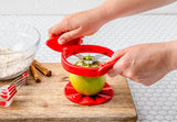 Flapple, the space-saving apple slicer and corer, features foldable raised handles for compact storage. Its auto-aligning base ensures precise cuts without a cutting board. The wide double-reinforced Japanese stainless steel blade effortlessly divides apples into 8 equal pieces, while a secure locking mechanism ensures safe storage.