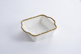 The Golden Salerno Square Baker willI show off your culinary skill and presentation by serving up delicious entrees or pastries in these elegant dishes. Gleaming white porcelain with lustrous gold beads in titanium.