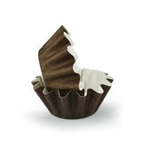 The Floret Baking molds are a free-standing, pure cellulose cardboard baking mold that features a PET-laminated interior that provides a easy release characteristic. The mold is folded to have scalloped edges to form the shape of a flower. The mold features a solid brown side wall on the outside and a white inside.