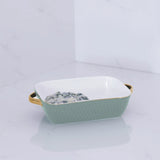 Sage advice. Serve up something colorful from Beatriz Ball. Our CERAMIC Small Rectangular Baker with Gold Handles in sage green is as practical as it is beautiful. Made of an oven, microwave and dishwasher friendly porcelain, the baker features a handsome textured rectangular body, a pleasant sage green exterior with gloss glaze), a sparkling white interior, and rich real gold painted handles and border detail.