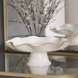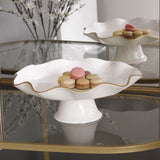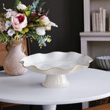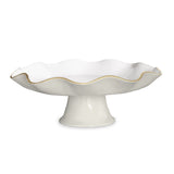 The ENCANTO Carola Pedestal Cake Plate (Cream and White) features elegant curves, a two-tone finish rimmed in gold, and soft cream tones. Perfect for cakes, fruits, and desserts, it pairs beautifully with other ENCANTO pieces for a versatile, vibrant, and sophisticated entertaining set.