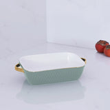 Sage advice. Serve up something colorful from Beatriz Ball. Our CERAMIC Small Rectangular Baker with Gold Handles in sage green is as practical as it is beautiful. Made of an oven, microwave and dishwasher friendly porcelain, the baker features a handsome textured rectangular body, a pleasant sage green exterior with gloss glaze), a sparkling white interior, and rich real gold painted handles and border detail.