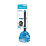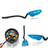 Lestrain, a scoop strainer, minimizes mess with a unique head that catches drips in its integrated reservoir. Ideal for various tasks, from frying dumplings to straining peas, its curved handle design keeps counters clean by elevating the head. Perfect for scooping and serving with a large, flexible head.