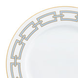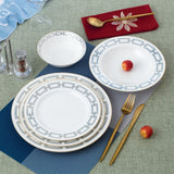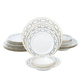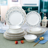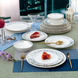 The Abbey Light Blue 20-piece bone china dinner set features a refined link design border in soft blue, blending classic charm with modern elegance. Its delicate detailing creates a timeless look, perfect for both everyday dining and special occasions.
