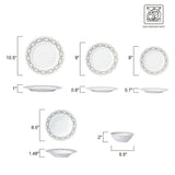 - Includes: Four 10.5in dinner plates, four 9in salad plates, four 8in dessert plates, four 8.5in soup plates and four 5.5in nappies