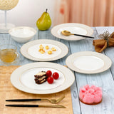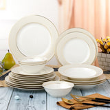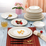 The Robin 20-piece bone china dinner set features a subtle gold honeycomb design along the rim, adding a touch of refined elegance. Its delicate detailing offers a modern yet timeless charm, perfect for both everyday luxury and special occasions.