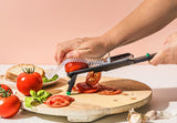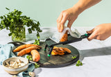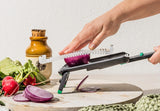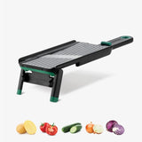 Nocutu is a mandoline designed for safer slicing, featuring a flexible finger guard that glides on built-in tracks so you can cut neatly down to the last slice. Pronounced 'no cut you,' it helps protect fingers while maximizing every ingredient.