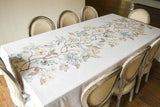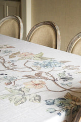 The Earthy Blossoms burlap tablecloth features a graceful runner-style design with branches, flowers, and leaves in soft peaches, blues, grays, and greens. Its muted, nature-inspired palette and rustic texture bring a serene, organic charm to dining spaces, perfect for casual meals or seasonal gatherings.