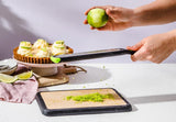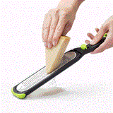 Ozest, a self-cleaning concave speed zester, swiftly clears clinging zest with a button push. The grater plate enhances contact for faster, safer strokes. Its 441 fine blades create fluffy, aromatic zest without bitter pith. The protective cover ensures worry-free storage and doubles as a 2 tbsp zest catcher.