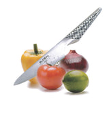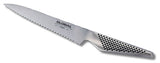 The utility knife falls somewhere betwen a chef's knife and paring knife in size.This medium-sized knife incorporates a serrated edge to easily cut items with thicker skin or crust and soft interiors like tomatoes, baguettes, and cheese.