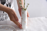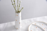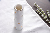 Present a small array of flowers in this small, sleek bud vase from our Heart-to-Heart Collection. Small, but will make a big impression in your kitchen or on a nightstand. Features gleaming white porcelain with delicate gold-tone decorations.