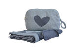 This cozy travel set includes a reversible cotton blanket with a charming heart graphic, a matching zip pouch with wristlet loop, and a soft sleep mask—perfect for travel, spa days, or meditation. Stylish, sweet, and ready to go wherever you do.