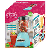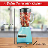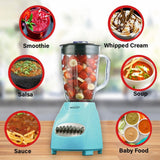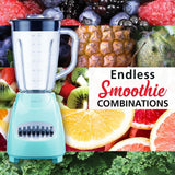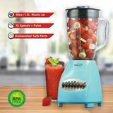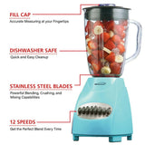 The Brentwood Blender features 12 speeds and stainless steel blades for crushing ice, blending smoothies, shakes, and more. It includes a 50oz BPA-free, dishwasher-safe jar with lid and has convenient cord storage.