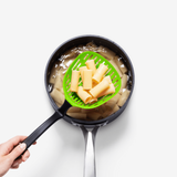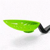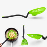 Lestrain, a scoop strainer, minimizes mess with a unique head that catches drips in its integrated reservoir. Ideal for various tasks, from frying dumplings to straining peas, its curved handle design keeps counters clean by elevating the head. Perfect for scooping and serving with a large, flexible head.
