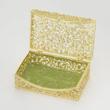 This contemporary box has an intricate gold finished pewter branch pattern, adorned with hand-set clear European crystals. Hinged lid. Light green hand-enameled interior. Tarnish resistant. Signature luxury gift box included.