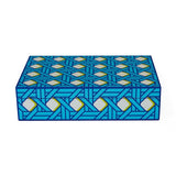 This box showcases a classic basket weave pattern in cool blues with a lime green accent. Hand-polished to a high-gloss and velvet-lined, it’s a chic, preppy addition to your shelf or table—perfect for stylishly storing your essentials out of sight.