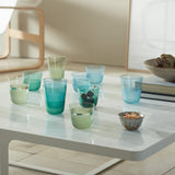 The Arc tumblers blend translucent and matte finishes, offering a tactile contrast that plays with light. Their soft silhouettes fit comfortably in hand, and the tonal colors allow for unique combinations. Cold-cut, fire-polished rims, and dual organic paints create a striking half-translucent, half-matte effect.