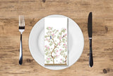 Our premium airlaid guest towels offer a linen-like feel with exceptional absorbency and strength. The front features a delicate tracery of trees adorned with pink flowers and perched birds, printed in rich detail. Perfect for any occasion, they bring a graceful, nature-inspired touch to your setting.
