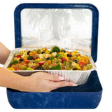 Fancy Panz in Blue Marble lets you dress up, protect, and serve from foil pans with style. Sturdy, stackable, and freezer-friendly, it’s perfect for entertaining—just drop in your foil pan for a polished marble-look presentation.