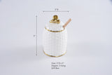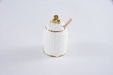 The Pampa Bay Honey Jar Set, made of white porcelain with gold titanium accents, includes a lid, wooden dipper, and comes beautifully packaged. Perfect for Rosh Hashana or any occasion, the gift box features a customizable sentiment inside, making it a perfect hostess gift!
