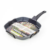 Resistant and durable with eco=friendly nonstick coating. Bakelite handle. Oven-prroof to 350F. Thick cast aluminum construction. Also good for induction stoves. Grill meats, veggies, fish and more to perfection!