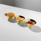 The Striations Nut Bowl Set of 3 by Anna New York is a refined accent for modern entertaining. Crafted from gold-plated stainless steel, each bowl features a sculptural surface inspired by natural striations in grasses and glacial formations, bringing artful shine and quiet sophistication to the table.