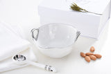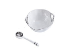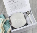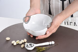 The Get Gifty Round Handles Set is ideal for all gifting occasions or to simply enjoy for yourself! Beautifully packaged in a gift box with a fun sentiment on the inside cover that can be personalized. Great for serving candies, nuts, fruit or condiments! Both bowl and spoon made of gorgeous white porcelain with silver titanium accents and trim.
