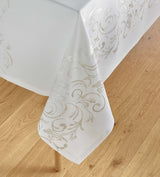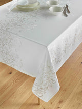 You don't have to worry about spills on this fabulous no-stain tablecloth. Embroidered swirls in delicate gold and white stitching form a runner down the center, and a border around the edge. Carefully constructed from special ringspun polyester with special stain repellant.