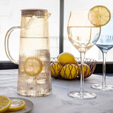 This Amber Stripe Tea/Water Jug features a warm amber striped glass body that adds character to the table. Designed with a comfortable handle and stable base, it includes a stainless steel lid with double-flow options for water or filtered teas. Ideal for everyday use or entertaining.