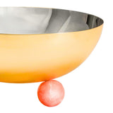 Enhance your gatherings with this elegant serving bowl, featuring a sleek geometric design. Gold metal contrasts beautifully with pink resin knob feet, adding a touch of modern sophistication to your table. Perfect for serving in style.