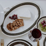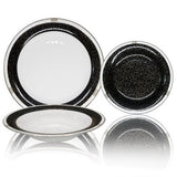 This unique and stylish black bone china dinnerware collection will be a great addition to your tableware. The dinner and soup plate are rimmed with a striking black, gold and white border, and the salad plate is a dramatic black and gold with a white rim. Extras, such as platters, nappy sets, etc. are available.