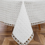 This modern openwork lace tablecloth features a contemporary geometric pattern, offering a fresh update to traditional lace designs. It includes an attached lining for added practicality, seamlessly blending modern aesthetics with classic functionality.
