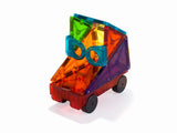 - 48 translucent, colorful shapes, including 3 large squares, and triangles (9 equilateral, 10 right, 6 isosceles.), 1 wheeled chassis, 2 imagination pieces, 2 hole punched equilateral triangles, 1 arch, 1 square door frame, 1 magnetic hinged door.