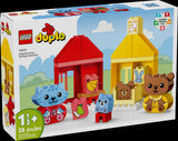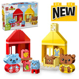 LEGO® DUPLO® My First Daily Routines: Eating and Bedtime teaches toddlers the importance of routines. This set includes a cat and kitten, and a bear with a cub, showcasing mealtime and bedtime. Animal babies have happy and grumpy expressions, helping toddlers express their feelings arond these activities.