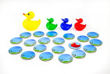 Quack, Match and Move! Everything is ducky when Mama Duck has her ducklings in a row. But when players flip over a lily pad that matches the last duckling in line, they call out “Duck-a-roo!” and swim it to the front. The game ends when Mama swims back to the front after the last match, and players count up their lily pads to see who wins.