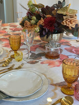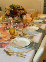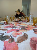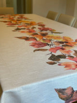 The Fall Floral burlap tablecloth features vibrant autumn leaves cascading down its length, creating the look of a built-in runner. With rich seasonal hues and a rustic texture, it’s a warm, inviting addition to harvest gatherings, festive dinners, or everyday autumn decor.
